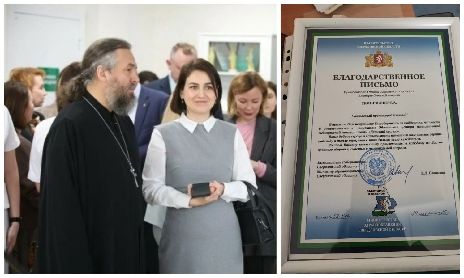 Екатеринбург, ул. Кирова, 65 19 марта 2026 года, во время визита в Детский хоспис накануне его 5-летия, заместитель губернатора — министр здравоохранения Татьяна Леонидовна Савинова вручила благодарственное письмо руководителю Отдела социального служения Екатеринбургской епархии и Православной Службы Милосердия протоиерею Евгению Попиченко.